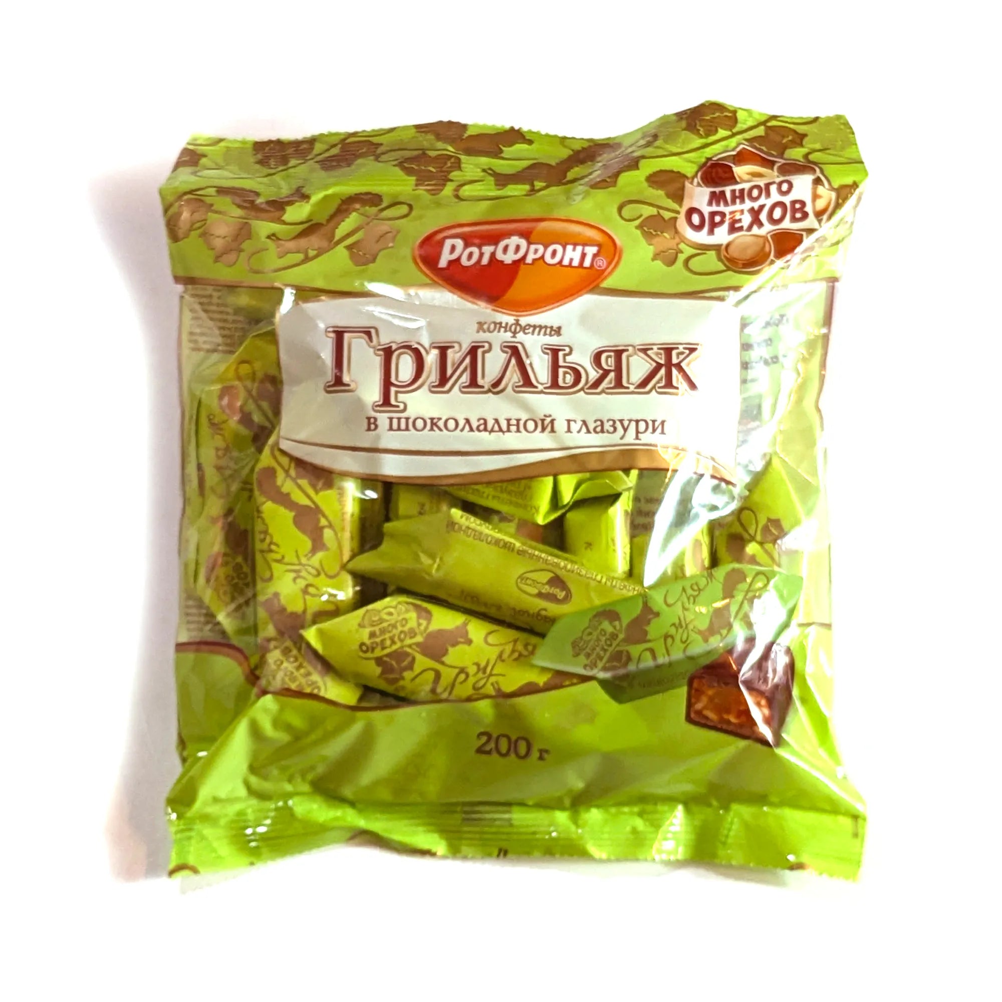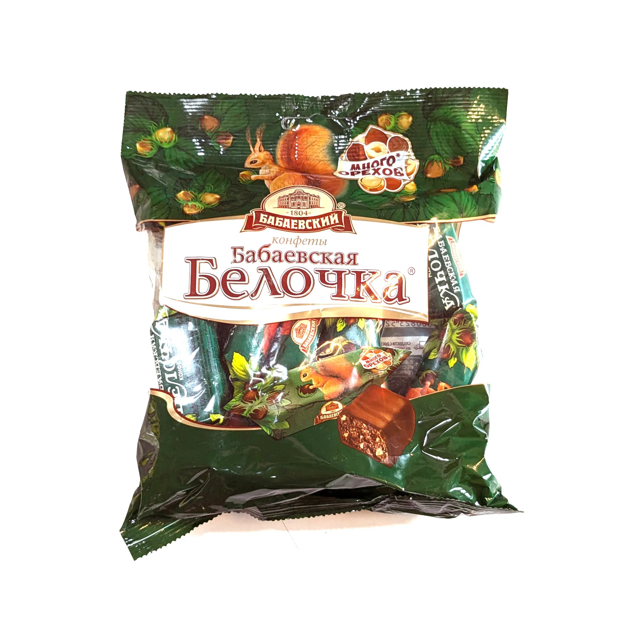 A classic Russian sweet that lives up to its charming name — Belochka means “squirrel,” and this candy captures that playful spirit with a rich, nut-studded chocolate treat. Made with a praline-style hazelnut filling and enrobed in a smooth chocolate glaze.